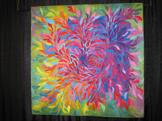 As the class unfolded I was unhappy with my fabric color selections. I was going to just pitch the class project and start over with something different, but decided to go ahead and finish it in order to try out the techniques. Once I got the various yarns stitched down I didn't hate it as much. (click photos for larger view)